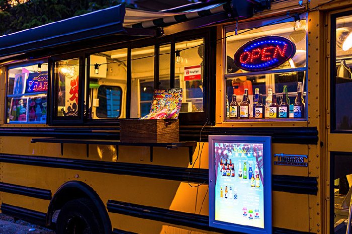 スクールバスをキッチンカーにリノベーションした、バー施設もあります。アルコール類の飲み物だけでなく、かき氷や花火も買うことができます。オープン時間は19:00~21:00のため、ぜひ夕食後にふらっと訪れてみてください。