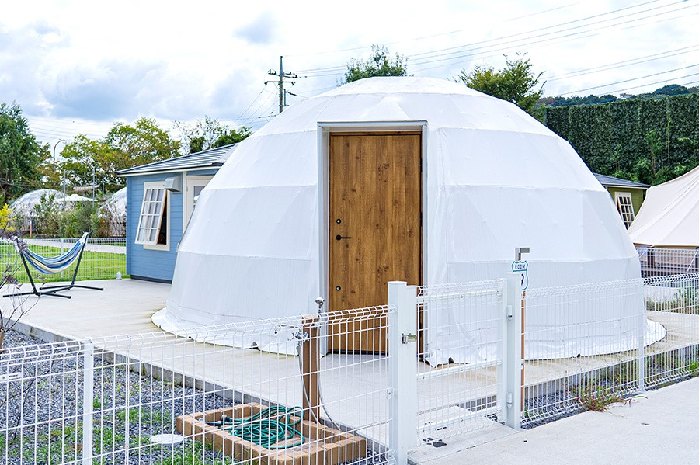 高滝湖グランピングリゾートには、ペット同伴に対応したテントも用意されています。3棟限定のペットドームテントは、サイトの周りが策で囲まれているため、犬をリードフリーで遊ばせることが可能です。
