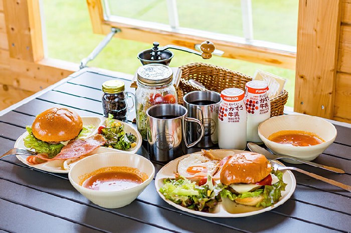 ハンバーガーやベーコンエッグ、季節の野菜を使ったジャーサラダにスープなどがセットになった、贅沢な朝食を頂くことができます。千葉県の酪農家さんの生乳のみを使用した、「おいしいかずさ牛乳」も飲むことができますよ。