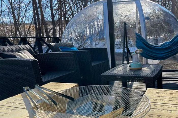 コテージ泊ながらウッドデッキにあるクリアドームテントでは、グランピング気分も味わうことができます。
