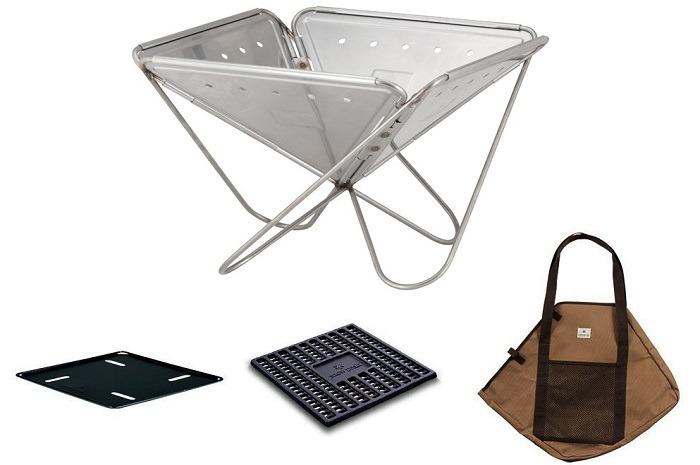 地面に灰や炭が落ちるのを防ぐベースプレートや、熱源の燃焼効率を上げる炭床Pro、収納時に肩掛けできるケースがセットになった商品です。