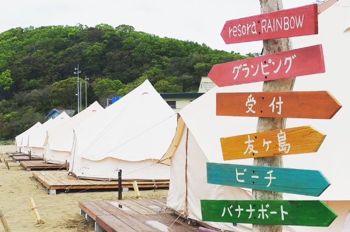 和歌山市の加太海水浴場内にあるグランピング施設です。ビーチにはウッドデッキとその上にコットンテントが張られており、そこで海や砂浜を眺めながらグランピングを楽しめます。ビーチで海水浴やバナナボートといったアクティブにも参加可能です。