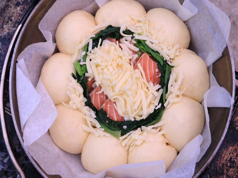 お肉料理も美味しく仕上げられるダッチオーブンですが、なんとパンを焼くことも可能です!パン生地を成形してドーナツ型になるようにダッチオーブンに並べ、真ん中にも薄くパン生地を敷いた上で、真ん中の窪みにホワイトソース、サーモンブロック、ほうれん草、チーズを乗せて、あとは焼くだけ!子どもも喜ぶダッチパンの出来上がりです!仕上げにバーナーでチーズを炙るとより食欲をそそる仕上がりになります。