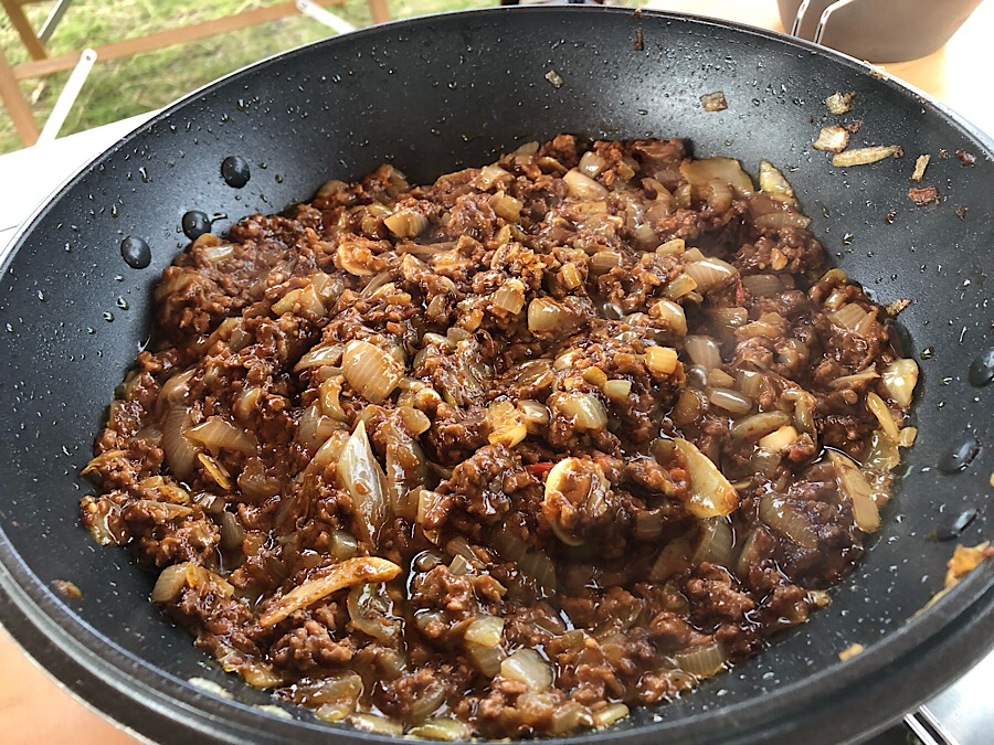 ミンチ肉と「ほりにし スパイス」を適量入れ、中火で炒めていきます。