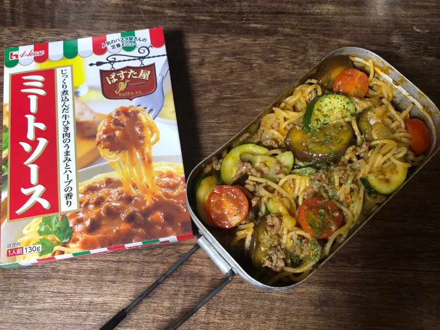 市販のパスタソースに野菜や挽肉をプラスする事で、彩りも栄養バランスもアップしたミートスパゲティをメスティンひとつで作りました。