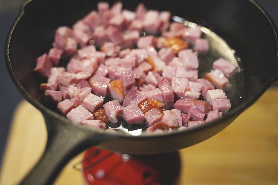 ベーコンやポテトを炒めた後、卵はスキレットに触れないように落として、しっかりと蒸して火を通すと、焦げ付きもなくとろとろの卵が出来上がりますよ!