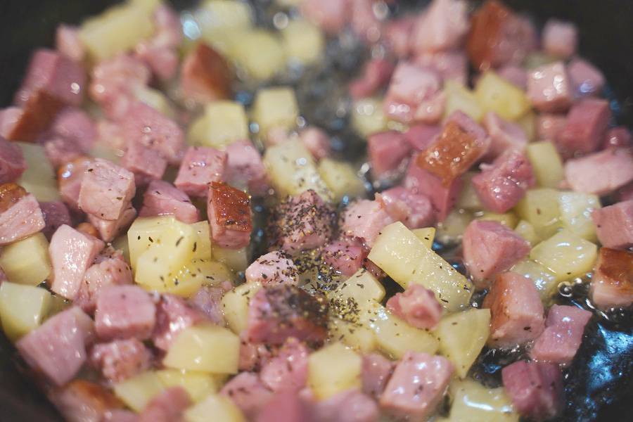 塩とブラックペッパーで味付けします。この時ベーコンから肉汁が出てくるよう弱火でじっくり炒めましょう。