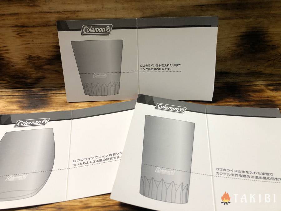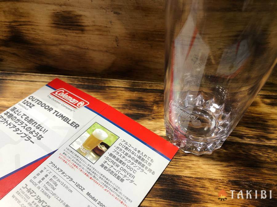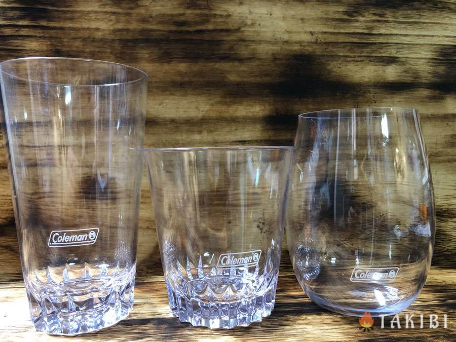 プラスチックの為落としても割れない、どれも100g前後と軽量、本物のガラスのような透明度、アルコールを入れてもひび割れない高耐久性、耐熱温度100度、とアウトドアでも手軽に使える商品の為購入しましたが、それだけではありませんでした。商品にメーカーのロゴが入る事はよくありますが、なんとグラスにあるColemanのロゴはただのロゴではありませんでした。タンブラーのロゴはカクテルを作る為、氷を入れた状態でお酒を入れる量の目安になっています。オールドファッショングラスのロゴは氷を入れた状態でウイスキーのシングルの量の目安、ワイングラスのロゴはワインの香りが最も良くなる量の目安になっており、アウトドアでより簡単に美味しくお酒が飲めるように考えられています。