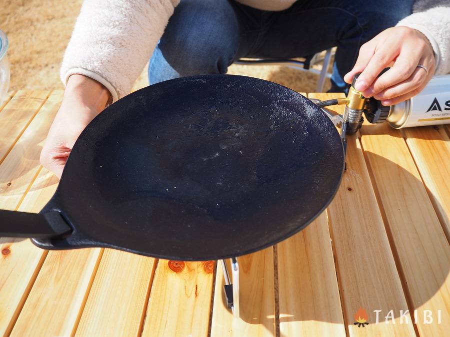 具材の準備ができたら、生地を焼いていきます。フライパンに油を引き、弱火~中火で加熱します。