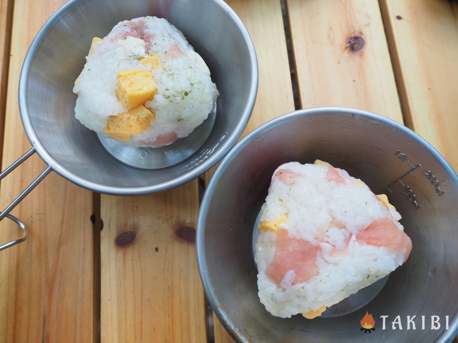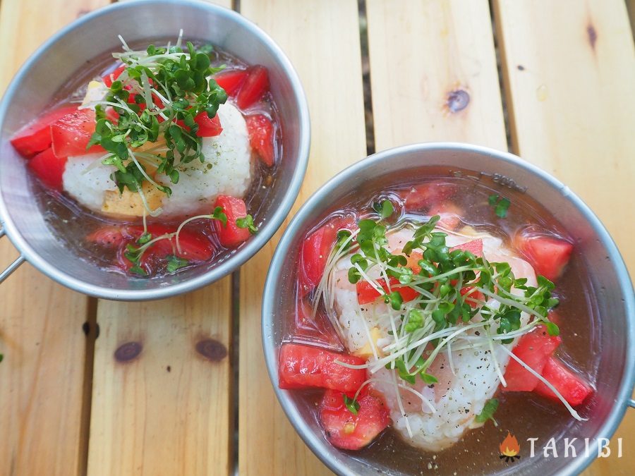 トマトスープが完成したら、おにぎりをシェラカップに入れ、ブロッコリースプラウトをのせます。最後にトマトスープをかけて完成です。