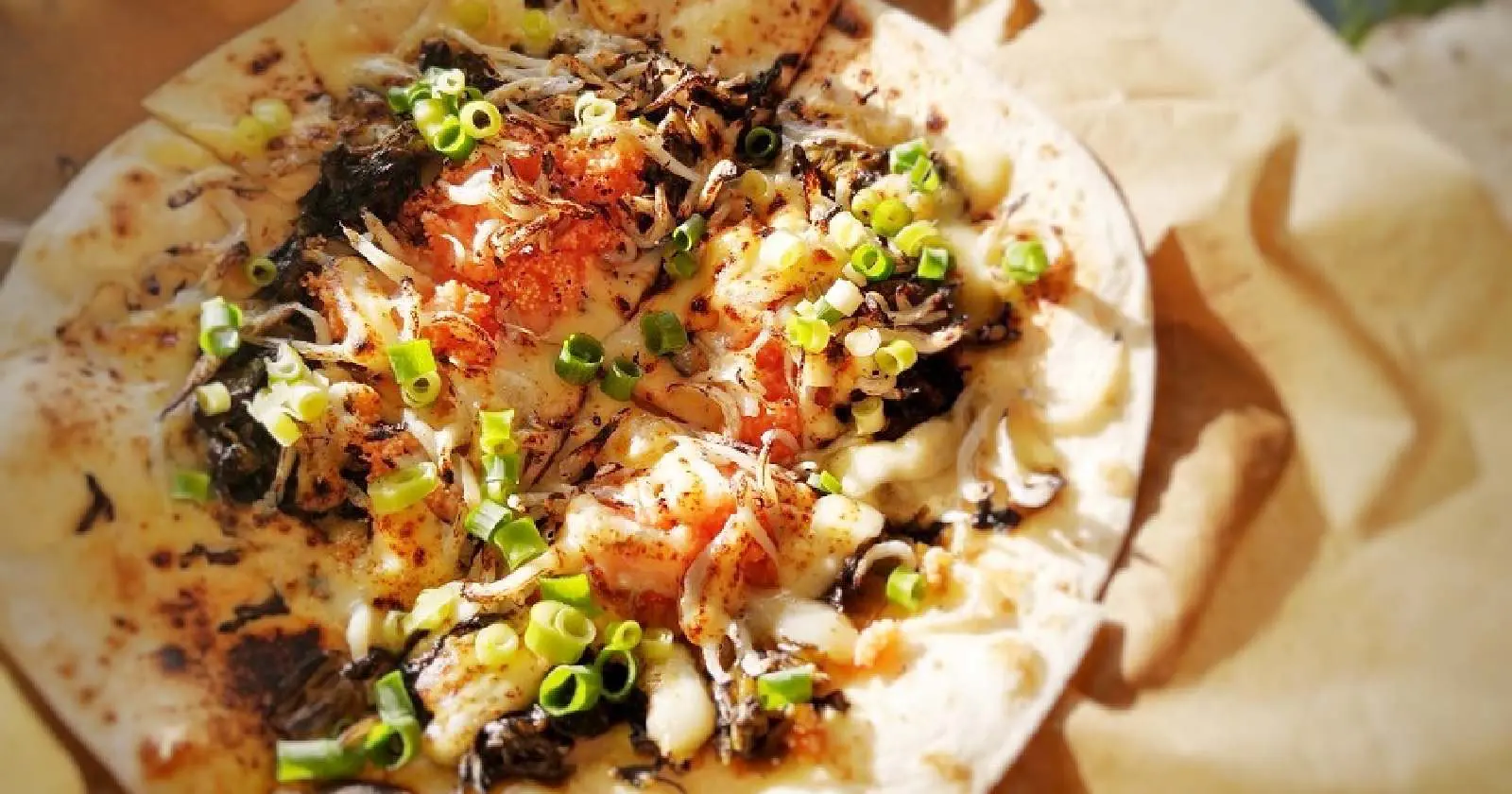この北出丼の具材をトルティーヤ生地にのせて、さっくり食べられるピザにしました。