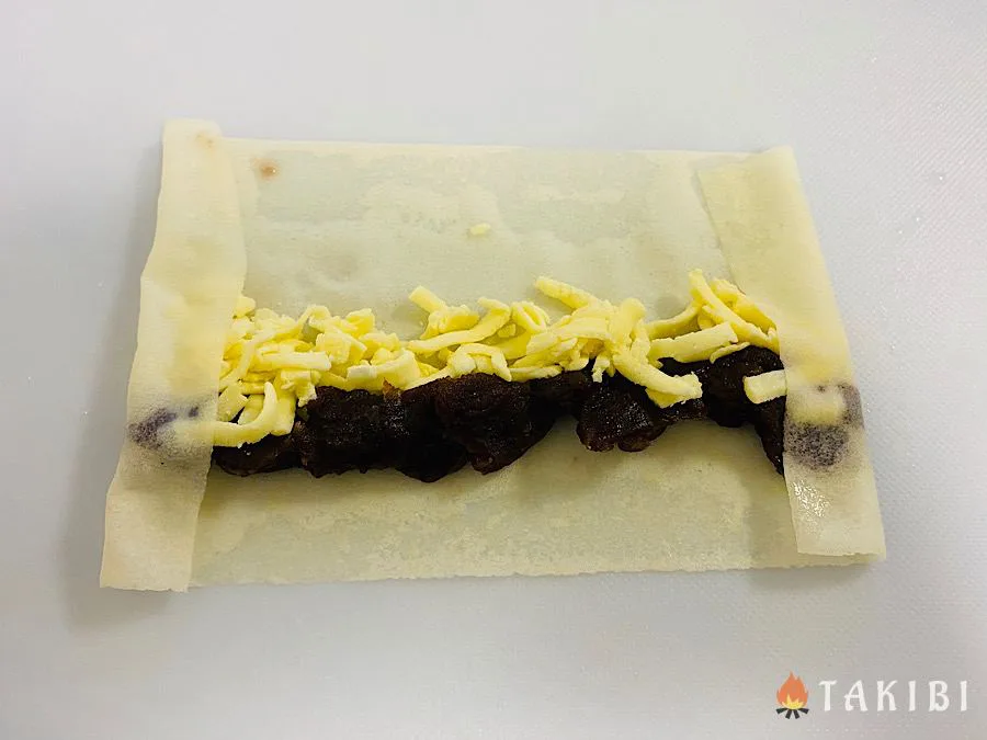 3.具材を載せた長い辺以外の3辺に糊付け用に水を塗り、2.で隙間を開けた両サイドを内側に折り込む。