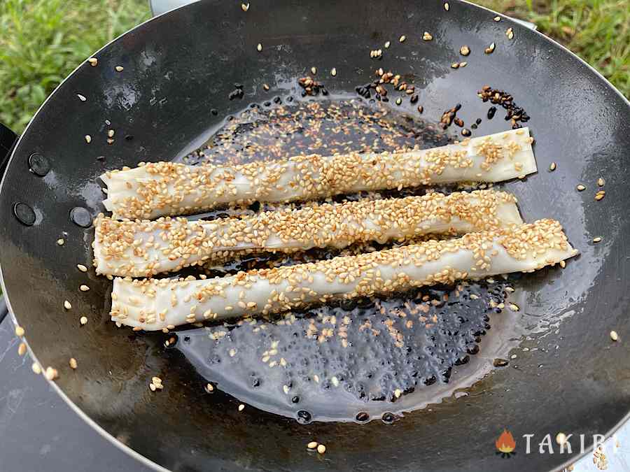 3.巻き終わった春巻きの外側にも全面に水をつけ、バットに敷いた胡麻をくっつける。そして焼き揚げる。