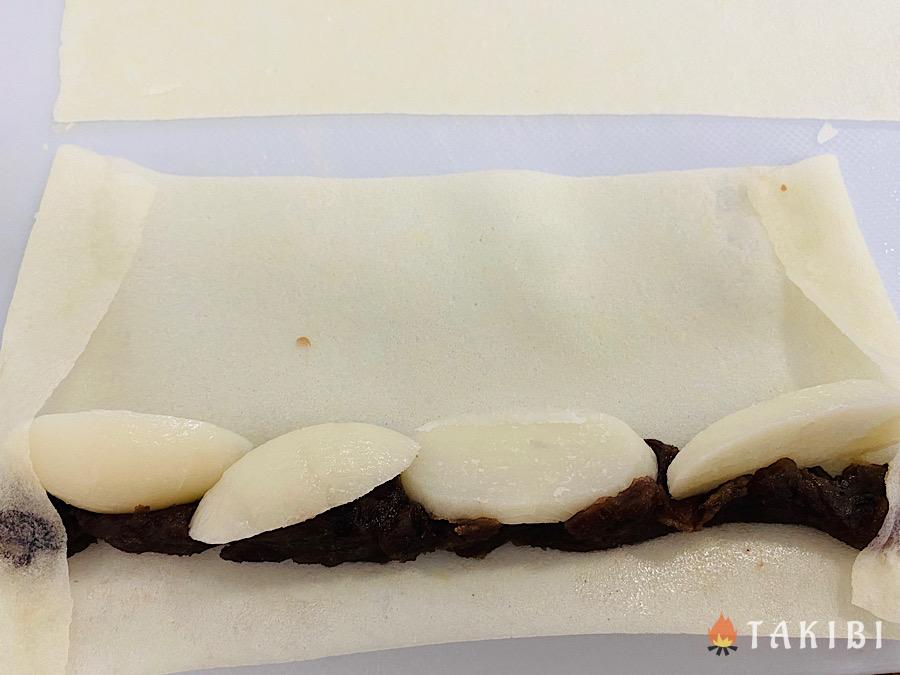 2.具材を長い辺の端に一直線に並べる。具材がはみ出ないように、直線の両サイドは少し隙間を開けておく。