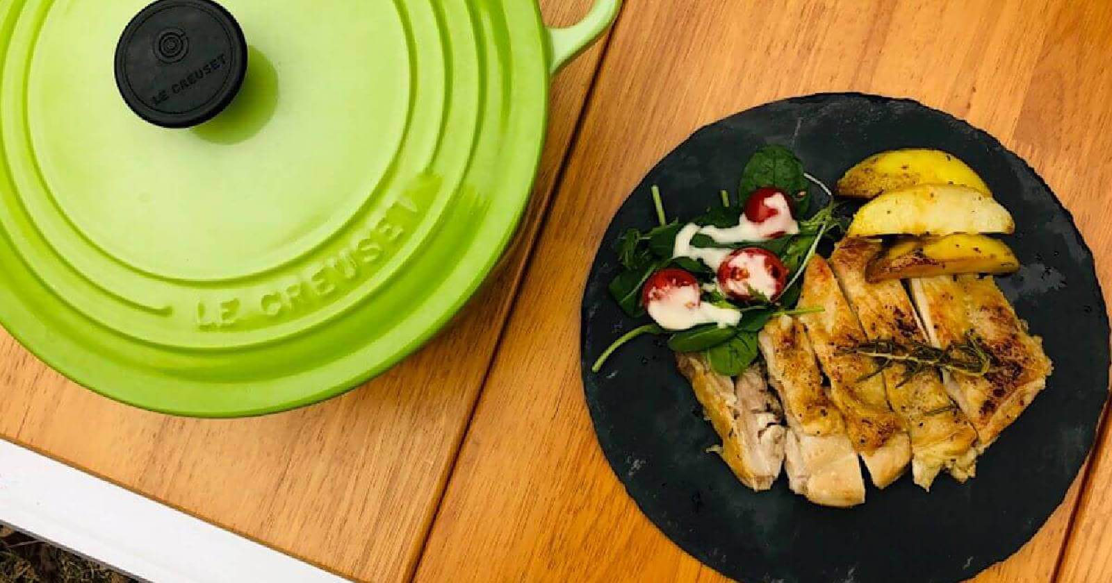 とっても簡単に!でも小洒落た感じの鶏モモ肉のハーブ焼きをご紹介します。今回は片付け簡単、調理時間も短い『ル・クルーゼ』を使いました。