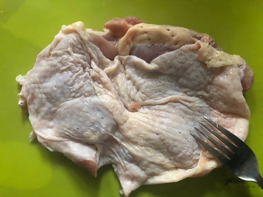 鶏モモ肉をフォークで、裏表数か所さします。肉が縮まないようにと、味を染み込みやすくするためです。