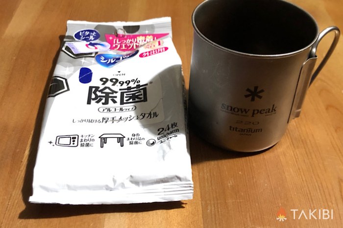 筆者もお皿やマグカップやカトラリー、クッカーなどの食器はお気に入りのものを使いたいので、使用後に食器を洗う手間を減らすために除菌ウェットティッシュを活用しています。