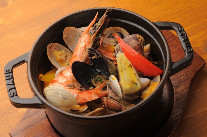 スキレットにオリーブオイルとニンニクを入れたら火にかけ、香りがしたら鯛を皮が付いている方を下にして焼きましょう。鯛を裏返し、アサリ・タコ・ミニトマト・パプリカ・酒・水を加えてアルミホイルでフタをしてください。あとは、アサリの口が開いてから白だしを入れてひと煮立ちさせれば完成です。