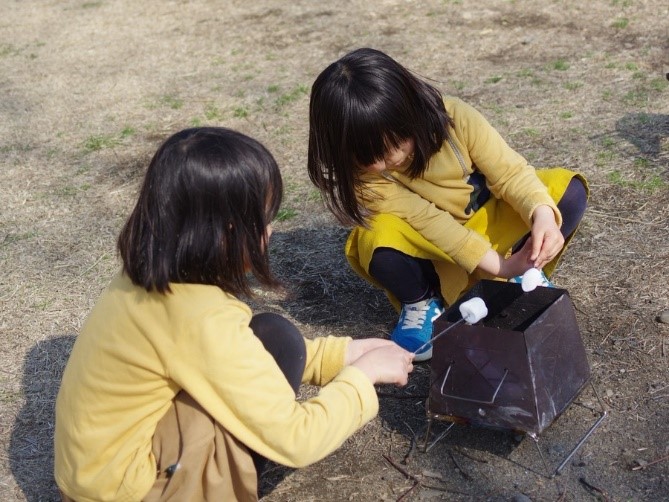 焚き火中に直火で焼くのも可能ですが焦げやすく危ないため、我が家はよくネイチャーストーブの残り火でマシュマロ焼きをさせています。子どもに任せていても失敗せずに良い具合に焼けますよ♪