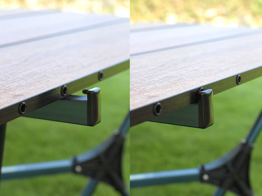 使用したい高さにポールを調節したら、梁となる2本のバーを取り付けます。バーにはテーブルの高さに合わせて3つの穴があり、ポールの先の小さなフックにひっかけるように取り付けます。コツは「クルっとかぶせる」感じで。