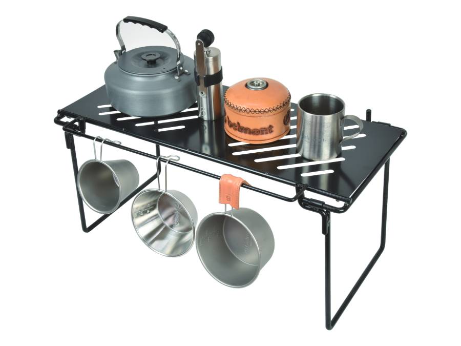 しかもテーブルの脇にいい感じのバーがあるので、そこにはシェラカップやコップを引っ掛けることができます。