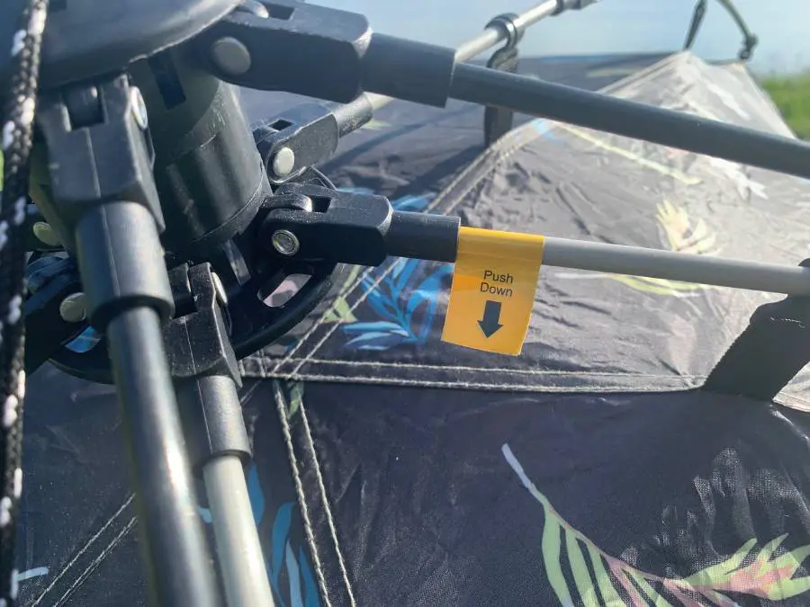 開く際に伸ばした柄が集まっている円盤上の横には「PushDown」の文字が