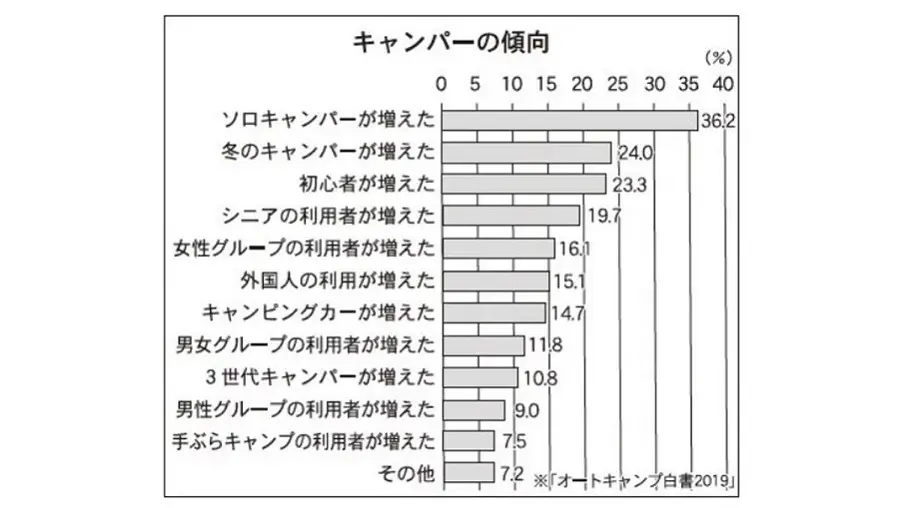 キャンパーの傾向をみてみると図にある通り、ソロキャンプ、冬キャンプ、シニアキャンプ、女性キャンプの増加など、キャンパーの層が幅広くなってきています。