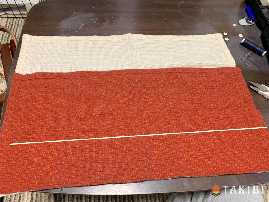 本体となるランチョンマットにポケット用のマットを重ねて、段差を付けて手前に折り返します。