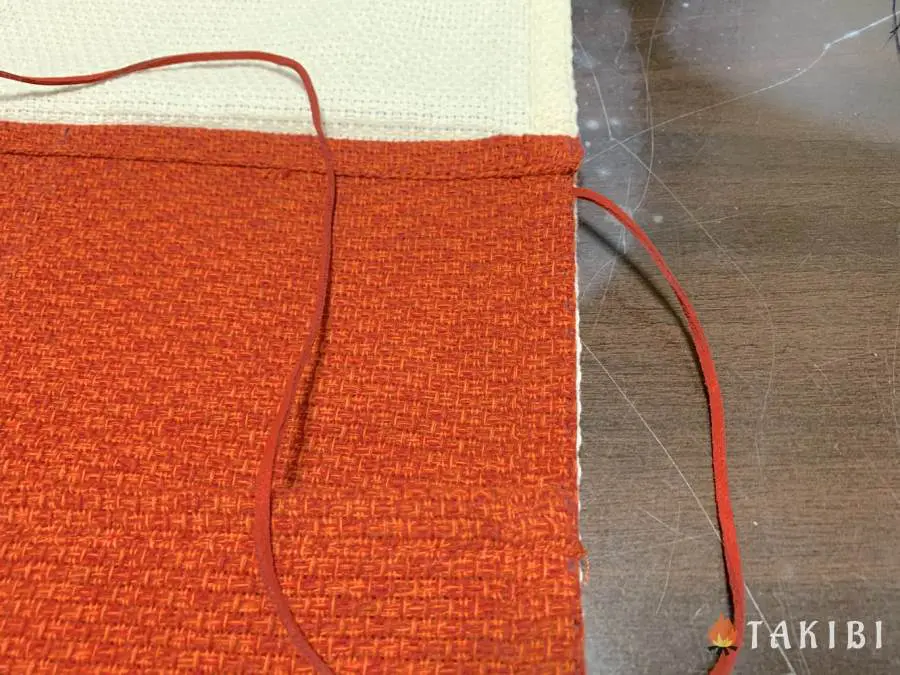 深いほうのポケットにスウェード紐を挟みこんで、右端を縫っていきます。