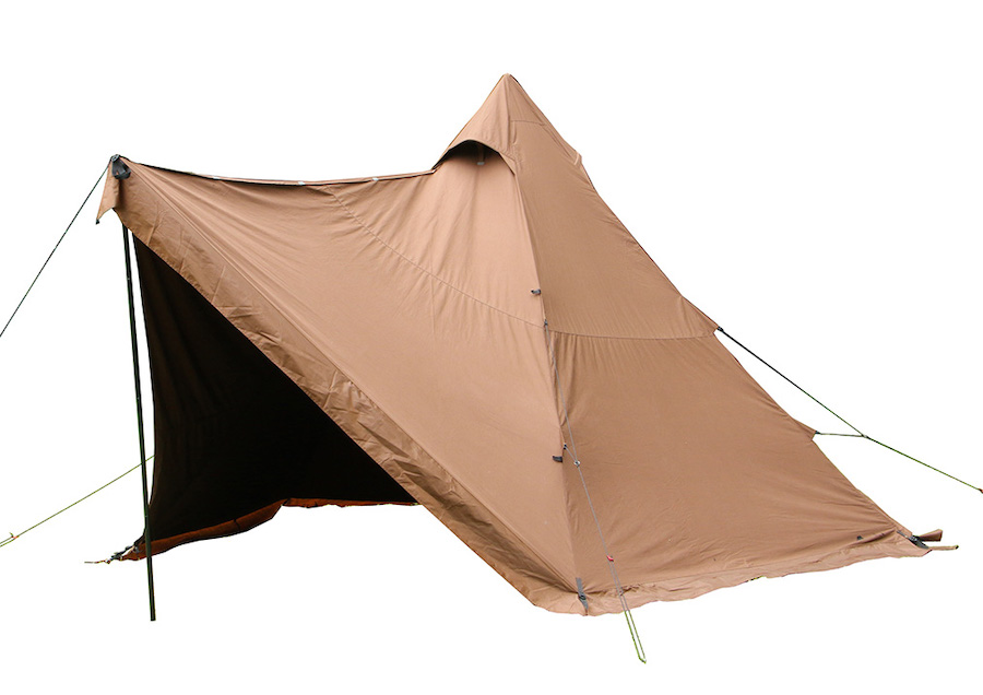 実際、ワンポールテントには前室らしい前室が存在しないため、複数人でキャンプ行って雨に見舞われた場合にスペースがないのが問題なのですが、それを手っ取り早く解決する方法には、テントの頂点に直接つないで前室のようにしてしまうコネクトタープがおすすめです。