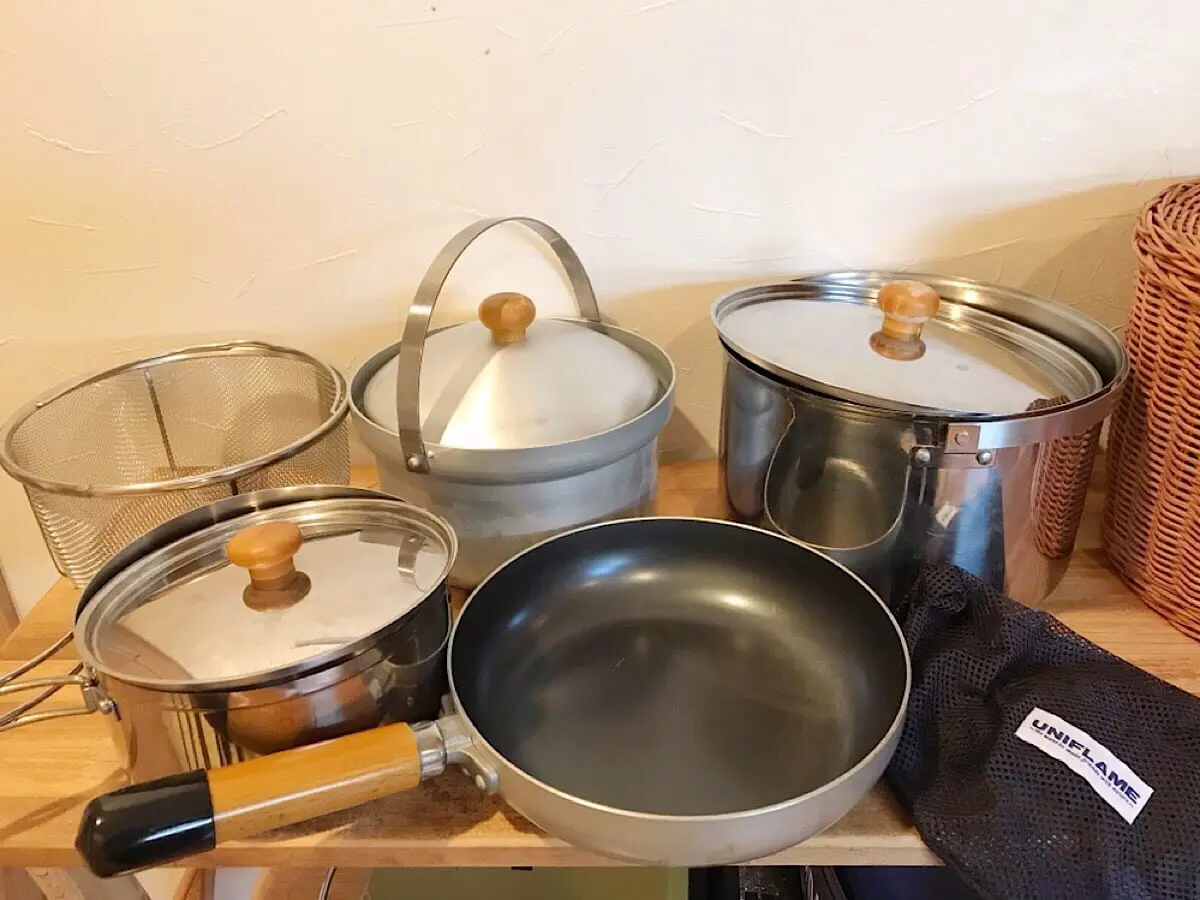 この中に大鍋からフライパン、ライスクッカー、片手鍋、メッシュバスケットと5つの調理器具がすっぽりと入っています。