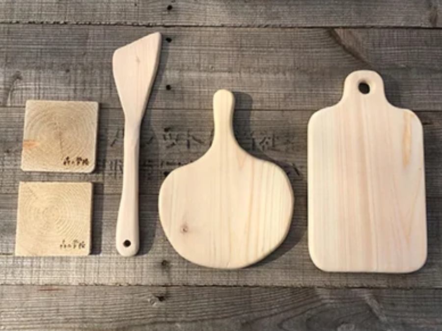 肌触りの良いヒノキ材を使用した2種類のカッティングボードを1枚ずつと、調理に欠かせないウッドターナーを1つ。そしてシンプルで使い勝手の良いスクウェア型コースターを2枚セットにした計5点セット!