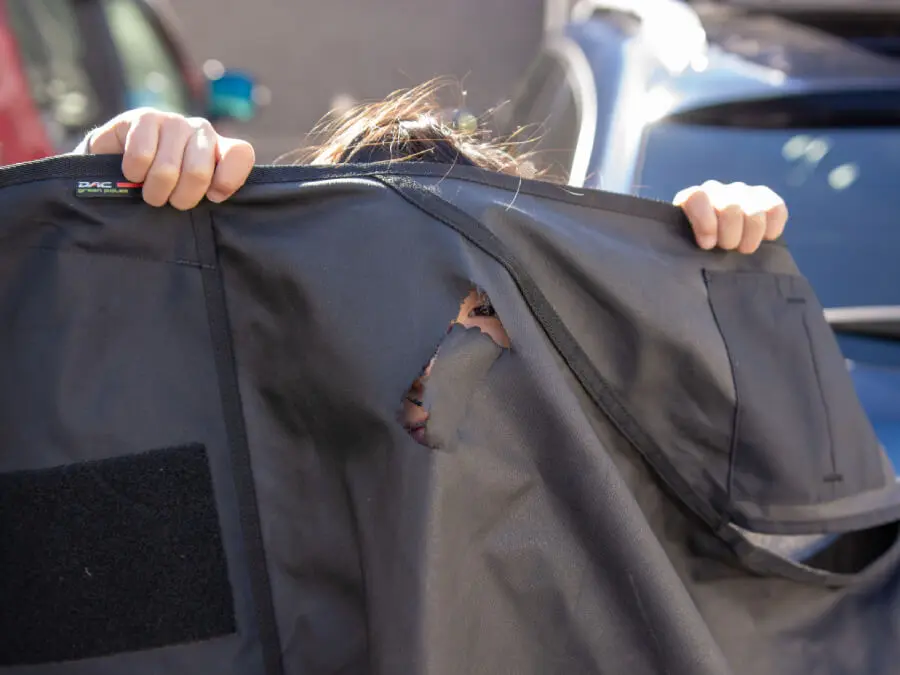 とか言っていると本当にやってしまいました。机の上に置いてあったコールマンのヒーターユニットに当たってしまい、見事な大穴があきました…(泣)