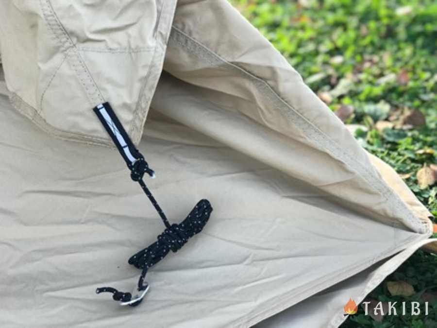 ループに繋がれているロープを前方へ引っ張り、ペグで固定してポールを立てます。