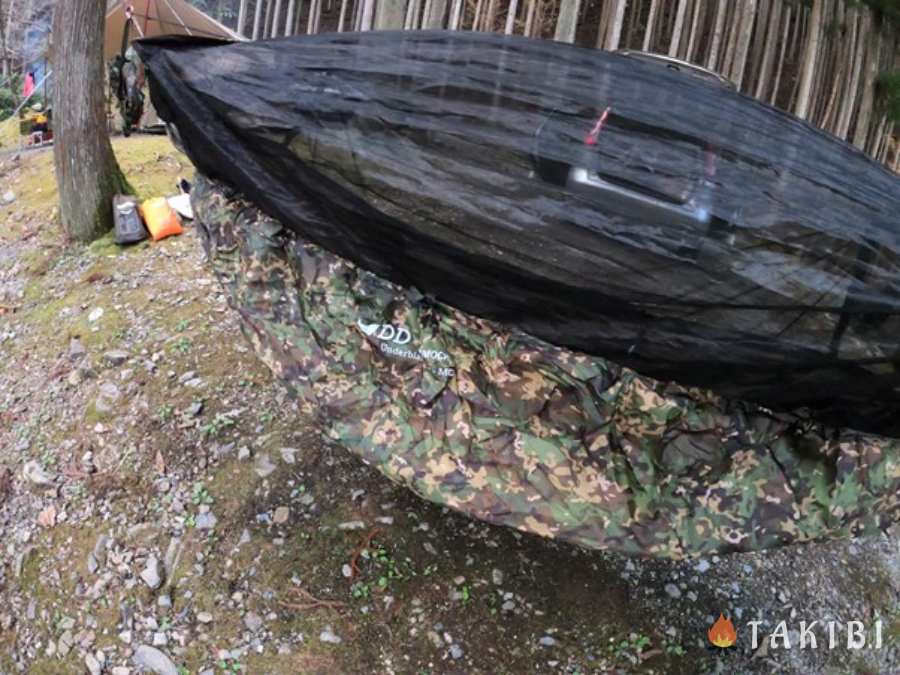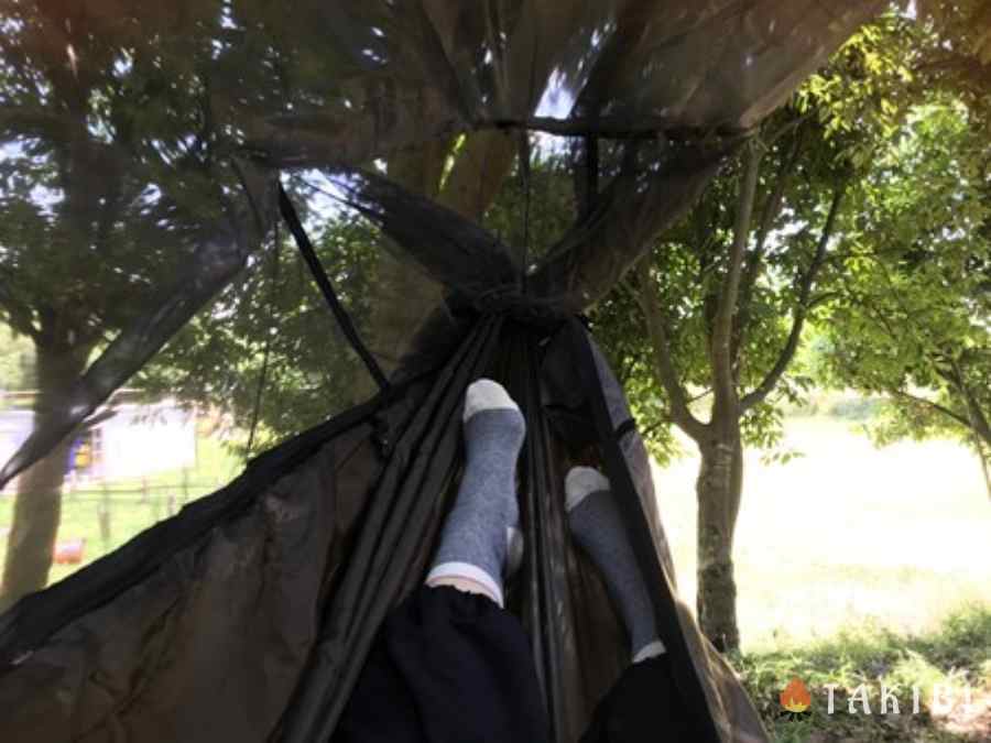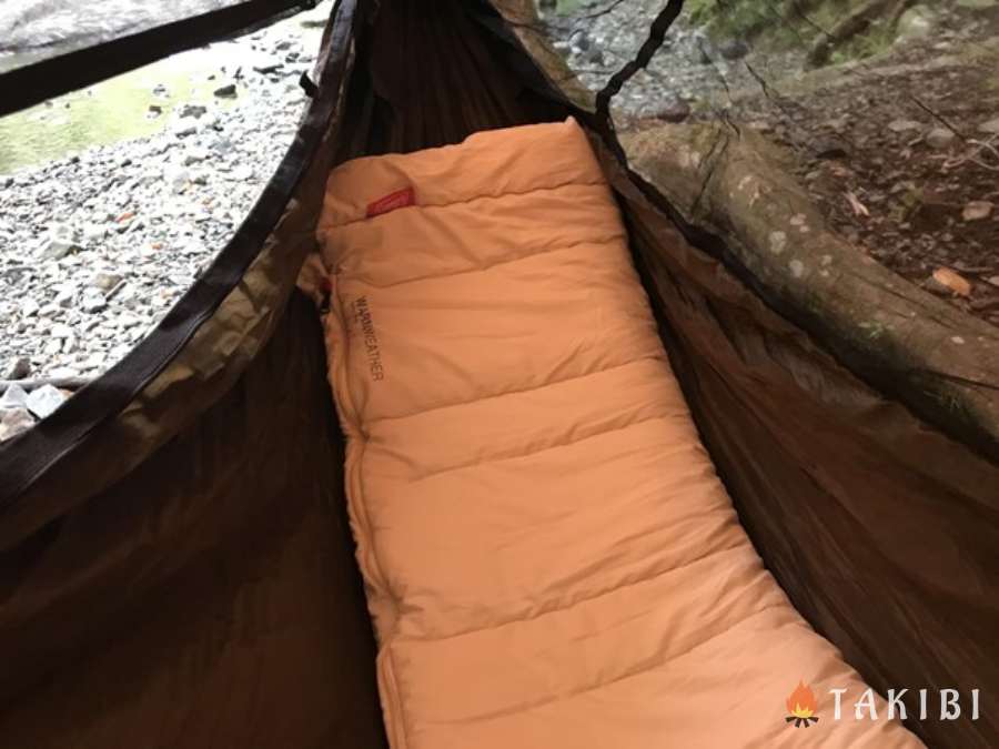 寝袋を開いて掛け布団にしていたので、ハンモックの中で布団に溺れそうになりました。笑
