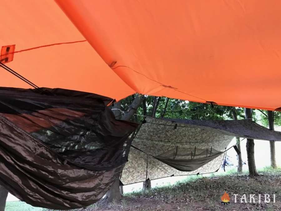 先にタープを張りその後ハンモックを設営すると濡れるのはタープだけ。
