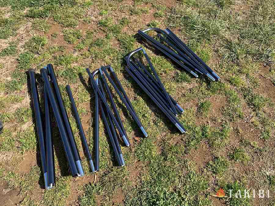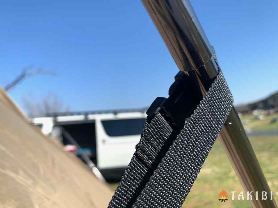その後、3か所ある三角形のエクステンションフレームを取り付け、周りをガイロープでとめていけば、基本的な設営は完了です。