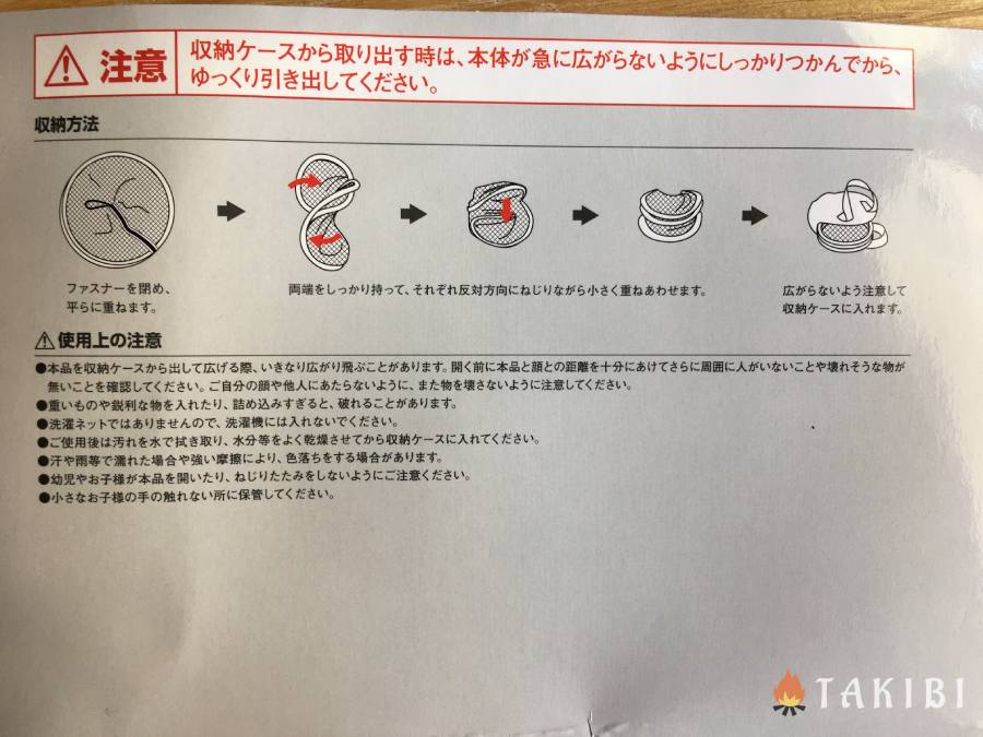 コールマンのドライネットはファスナーが持ち手の方についています。使用時は、ケースのファスナーを開けて、折りたたまれたドライネットを取り出します。その際、自分の手で広げる前にケースから出た反動で勢いよく開くことがあるので、周囲への注意が必要です。