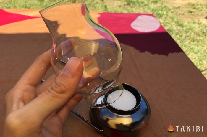 テーブルに置いてもいいですし、ランタンホルダーやタープなどに吊り下げても良いですよ。また、消火するときには、ホヤの上から息を吹きかけるだけ。とっても手軽です。