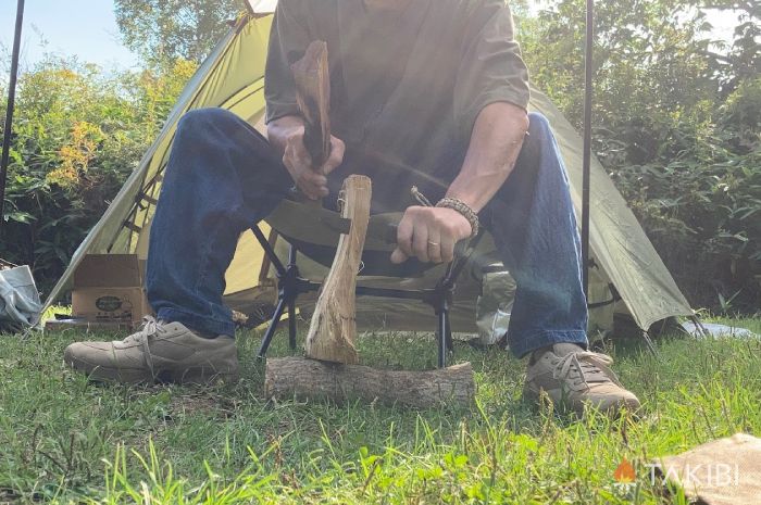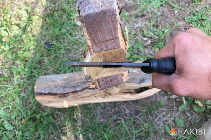 実際に使用してみると、やはりバトニングが非常に楽です。分厚い刃と本体の重量が合わさり、薪にサクサク刺さっていきます。しかし、これだけ無骨な仕様なのに、繊細な作業であるフェザースティック作りも難なくこなせたのには驚きました。