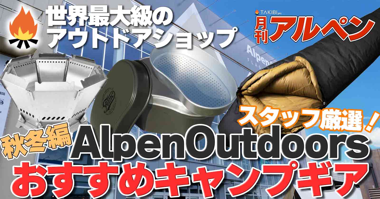 そんなAlpen Outdoorsで、最新ギアの情報はもちろん、スタッフがおすすめするキャンプギアや、季節やシーンに応じたおすすめキャンプギアなど、その月ごとに決めたテーマに沿ってたくさんの情報を我々TAKIBIチャンネルがお届けする「月刊アルペン」が今月から始動します!