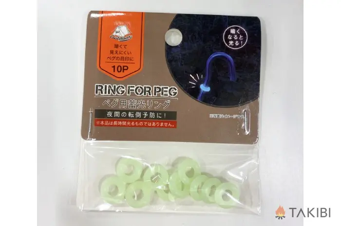 夜になると、暗くてロープやペグが見えずに足を引っ掛けてしまうことがあるので、この蓄光ペグリングをペグに取り付けて使ってみたものの…