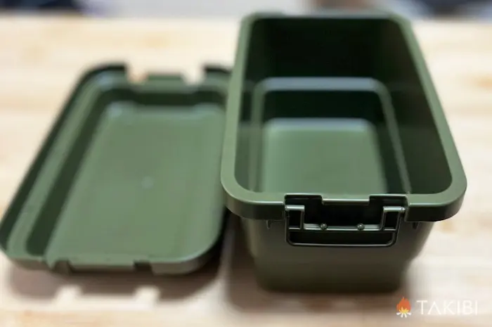 本家頑丈BOXの蓋はフラットな部分が広いので、テーブルとしても使えるという利点がありますが、バックルBOXは上部が狭すぎて物を置くには少し足りません。