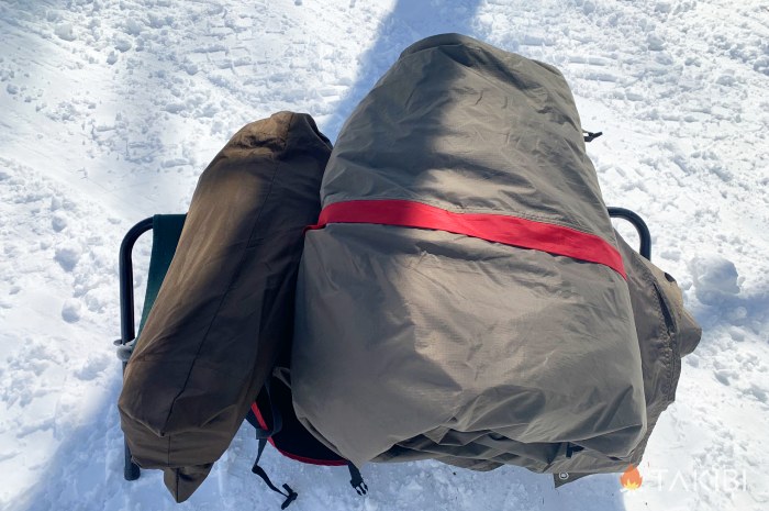 季節によっては別の小さなテントやコットなどを中に入れて、カンガルースタイルで就寝することが多いです。
