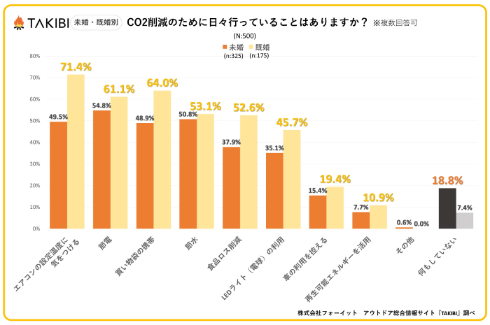 未婚・既婚別で見ると、CO₂削減のために何らかの行動を実践していると回答した方は、全ての項目で既婚者が未婚者を上回る結果となりました。