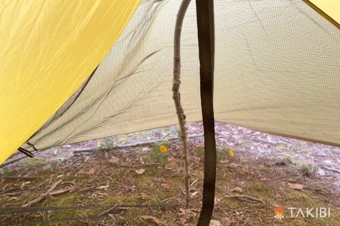 そのためフライシートと地面の隙間が広く、インナーは前後2面がメッシュで風通しが良いことが特徴です。逆に言うと、気温が低い秋〜冬の使用は寒く感じます。