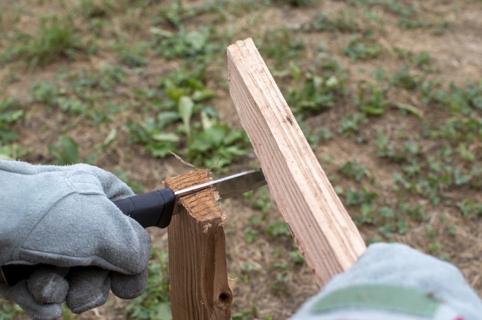 また、叩く道具ならハンマーの方が良いと思うかもしれませんが、ハンマーを使ってナイフを叩いてしまうと力が強すぎて破損する可能性があります。そのため、ハンマーより柔らかい素材でなおかつある程度硬さのある薪を使いましょう。