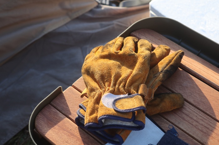 キャンプ用のナイフは柄にグリップ力を高めるための加工が施されている場合も多いです。しかし、だからと言って素手で扱うと手が滑って事故に発展する可能性も捨てきれません。滑り止めのためと手を保護するためにも、革製のグローブを着用して作業するようにしましょう。
