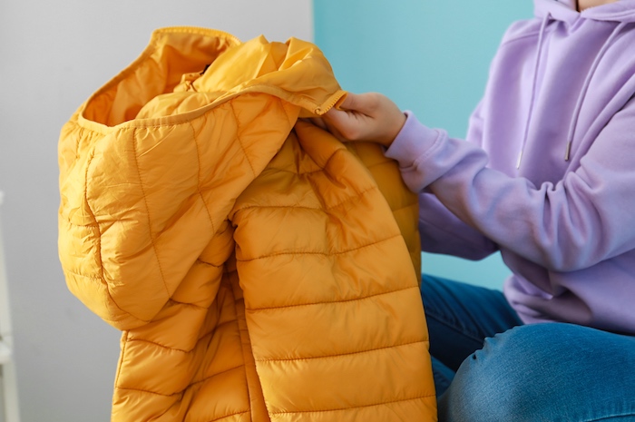 色落ちしないことが確認できたら、ダウンを裏返しジッパーやボタンを留めて、下準備は終了です。
