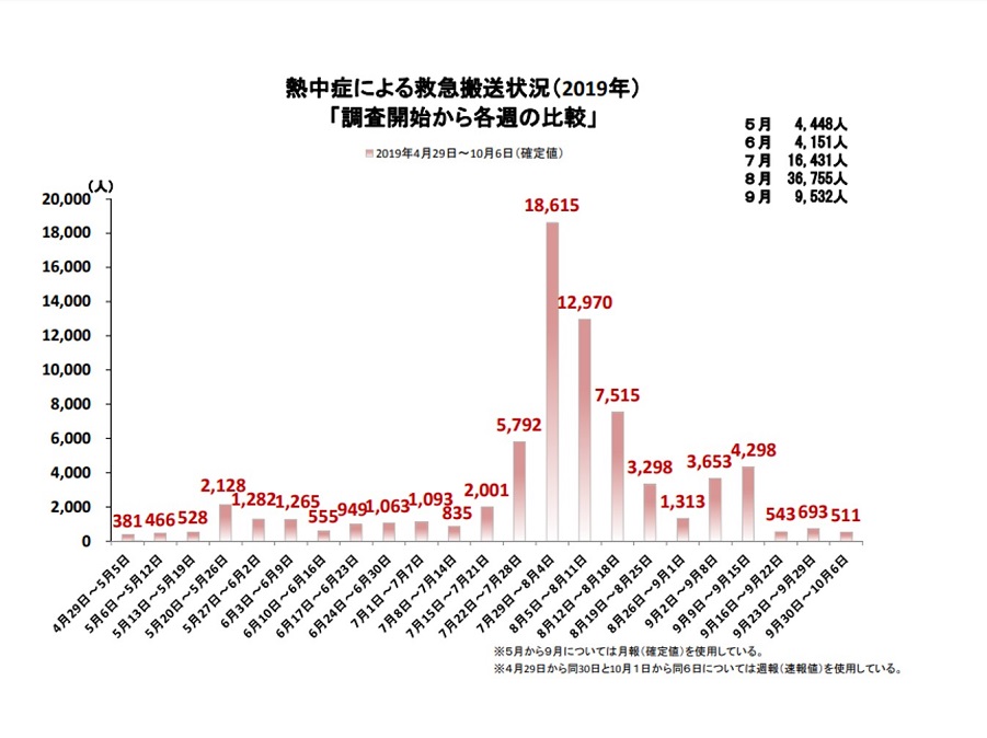上のグラフは、総務省消防庁から出ている2019年の熱中症による救急搬送状況です。